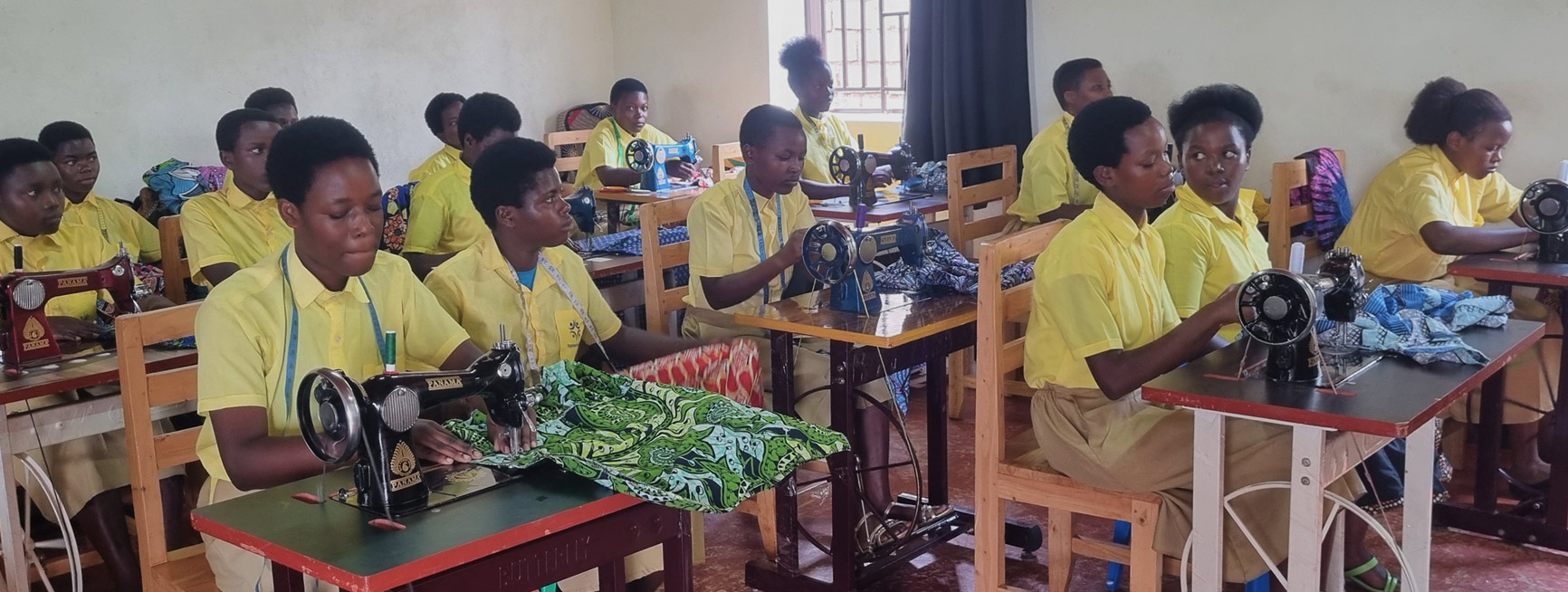 Dans le bel atelier récemment construit, la nouvelle volée de jeunes filles/femmes suit avec assiduité et succès sa formation de couturière, encadrées comme aide-formatrices par les 6 élèves formées dans la première volée.