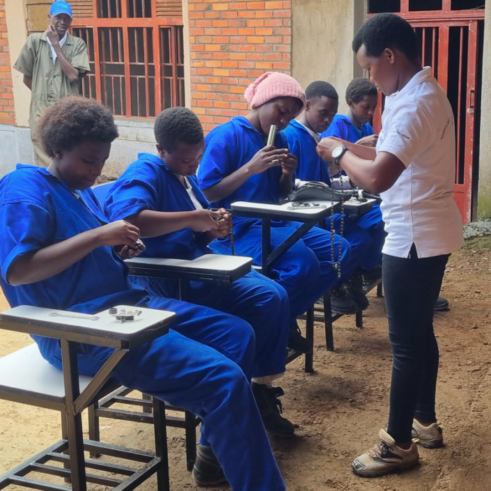 Joëlle Huguenin, coordinatrice du projet Urumuri au Rwanda, avec Alexis (vice-président), Yvan (gestionnaire), Dorothée (socio-thérapeute) et Faustine (traductrice) ont mené, avec fierté, la visite des locaux où sont formés les futurs professionnels, 8 femmes et 4 garçons, dans la mécanique et l’entretien des vélos, leur fabrication en bambou et la soudure. Les cinq formateurs, eux aussi formés par Urumuri, sont très motivés de transmettre à leur tour leurs connaissances, encadrés notamment par la socio-thérapeute dont le travail soude l’équipe et redonne confiance en l’avenir à tous les participants.